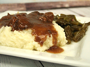 - Place 5 oz of mashed potatoes & 6 oz of beef tips & gravy over the top of the potatoes